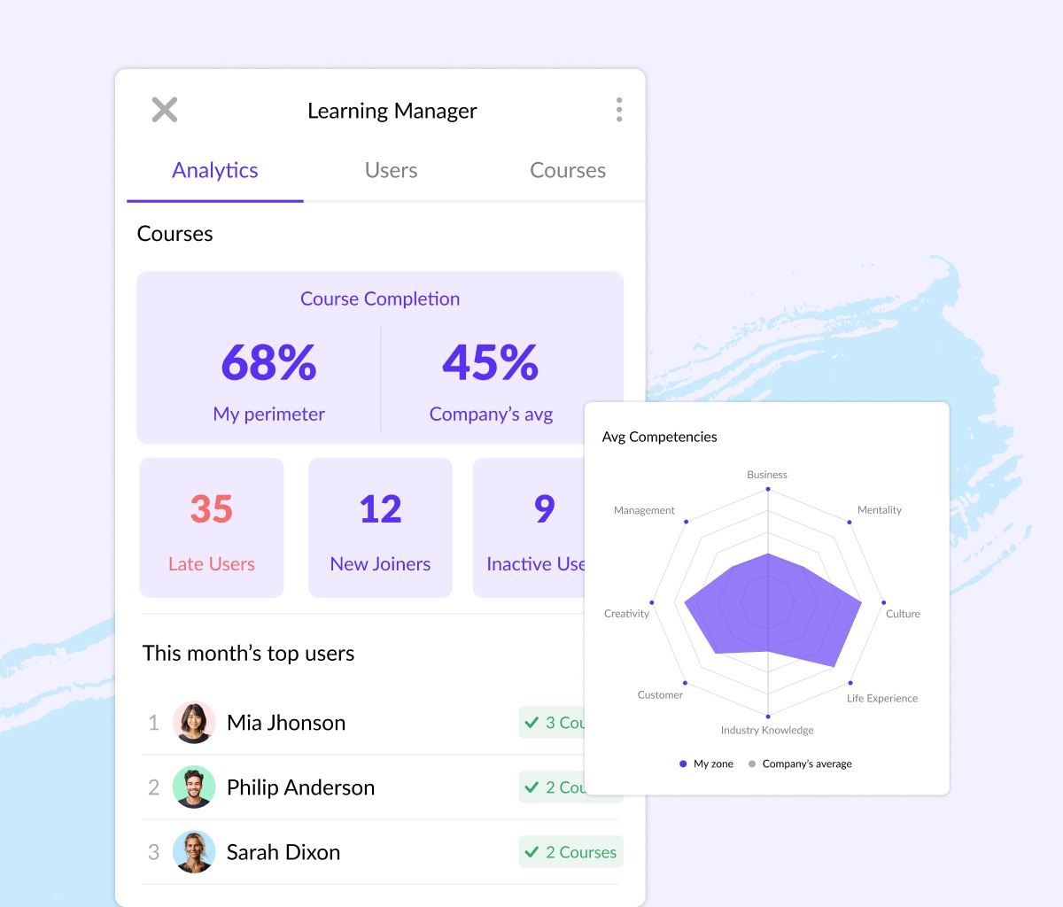 - Monitor team growth with advanced analytics, gaining insights into evolving competencies and identifying skill gaps