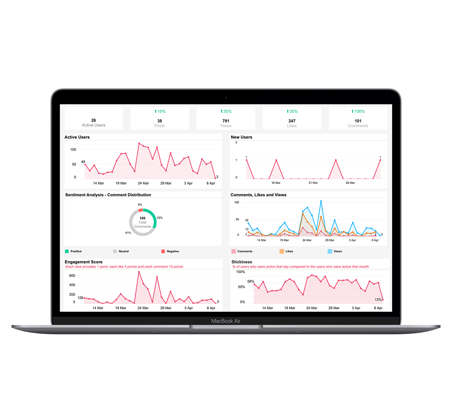 YOOBIC consente di monitorare utenti attivi, post, mi piace e commenti per misurare il tasso di engagement. Analizza le reazioni dei tuoi dipendenti usando la funzione Sentiment Analysis (AI) nella tua dashboard in tempo reale. Quantifica la soddisfazione dei dipendenti e agisci per aumentare il loro mantenimento e patrocinio.