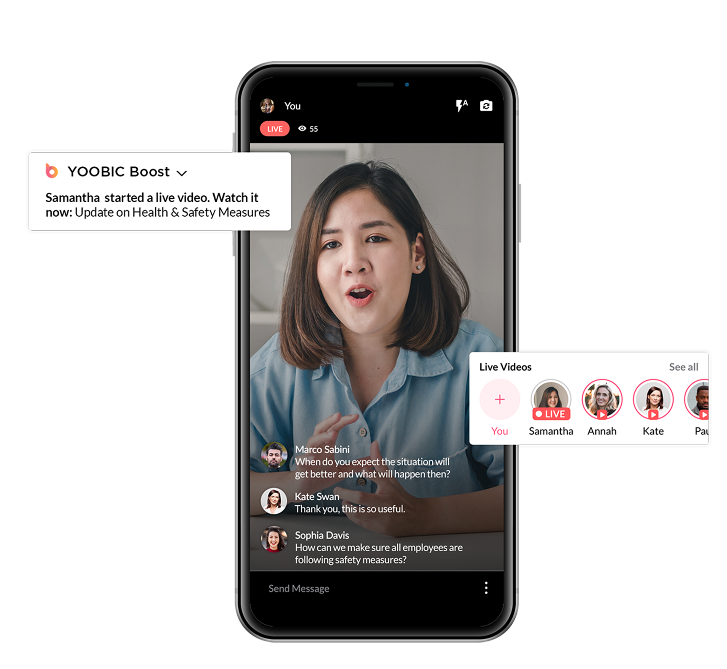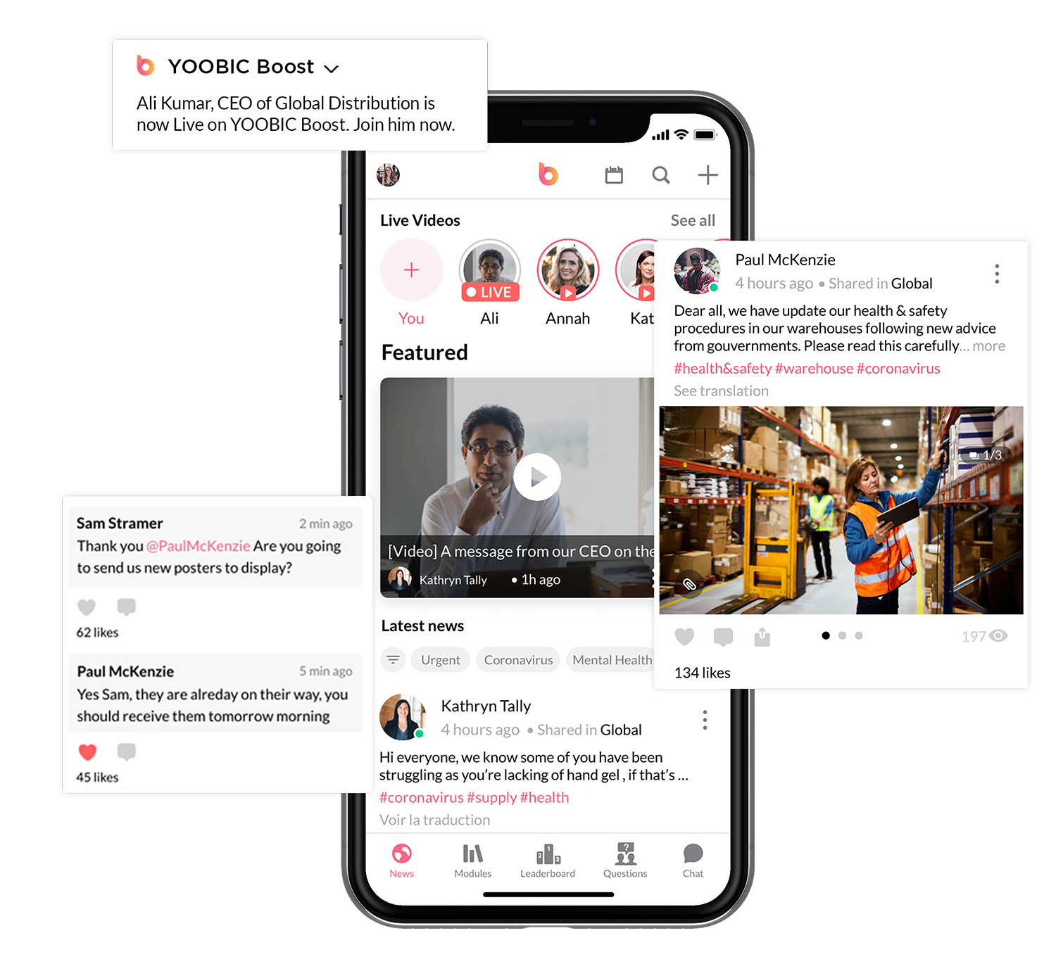 Trasmetti video in diretta per comunicare con i tuoi dipendenti sul campo in tempo reale o per organizzare corsi di formazione a distanza. Rispondi alle lore domande immediatamente e condividi il video dopo sulla Newsfeed per i dipendenti che non hanno potuto vederlo in diretta.