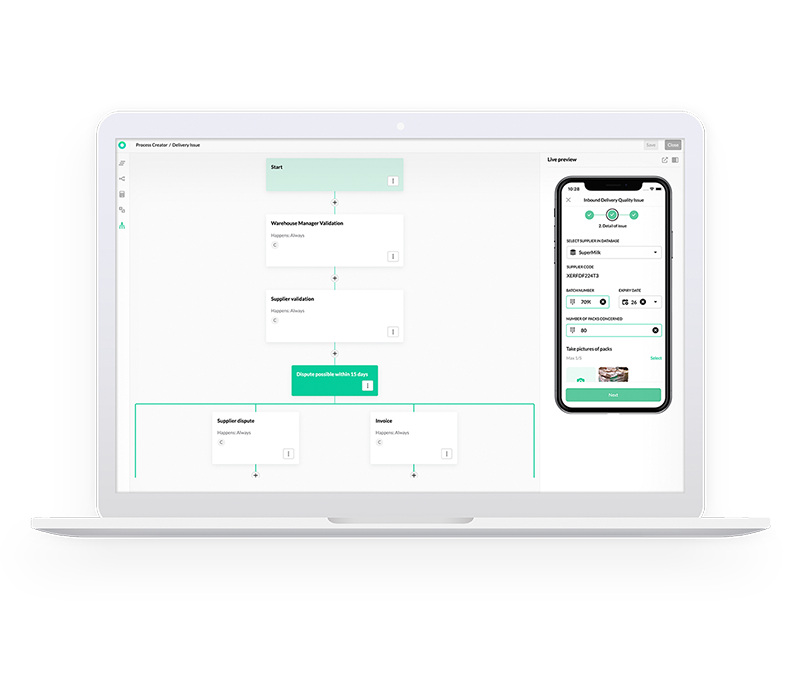 Logistics teams can create their inbound & outbound quality inspection processes with customized steps and forms to be completed by each stakeholder in the intuitive workflow builder. To manage delivery issues, they can create different workflows depending on the type of issue reported (delays, packaging, damages, temperature, quality, etc.)