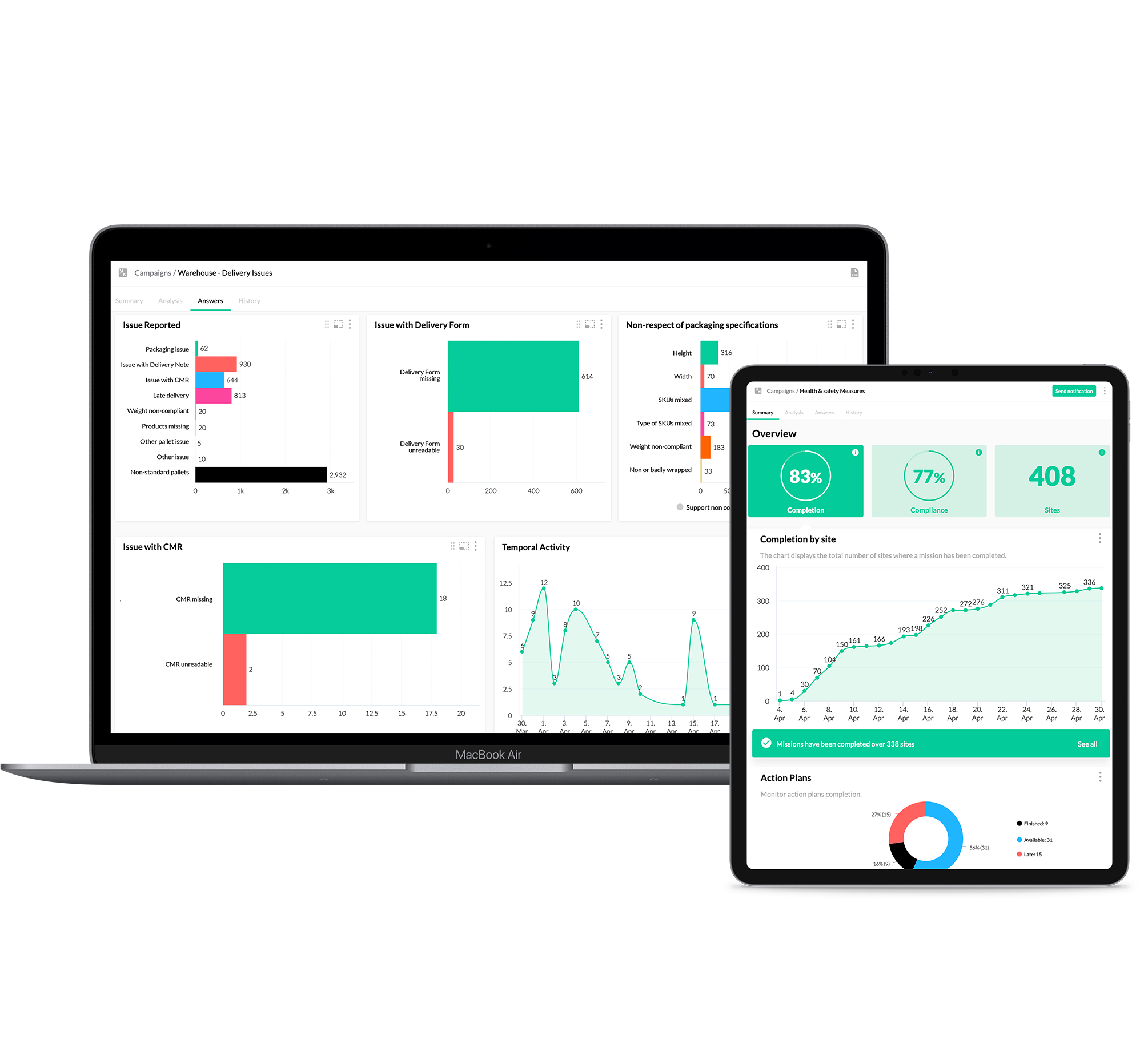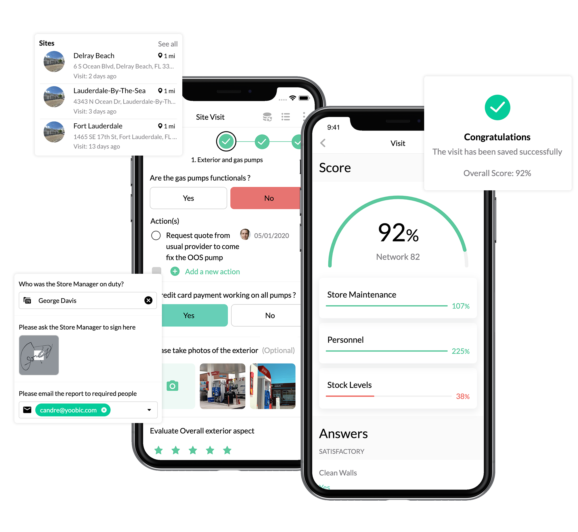 Fini les checklists papier, les fichiers Excel, les rapports et emails multiples. Fournissez une application intuitive à vos équipes terrain afin de réaliser efficacement leurs fiches de visites, audits, inspections et checklists. Un score est automatiquement calculé en fonction des réponses et vous pouvez facilement créer des plans d’action pour améliorer la performance de vos sites.