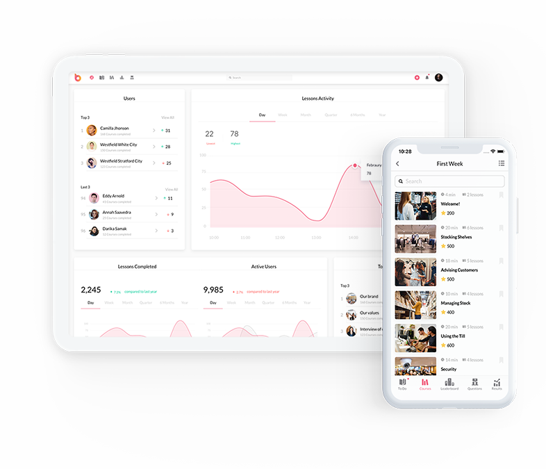 Easily onboard new employees and continuously train your store associates by sending them microlearning courses on the latest collections, your brands, and selling techniques. Test their knowledge with short quizzes and competitions, and encourage them to learn even more by rewarding them with badges and points.