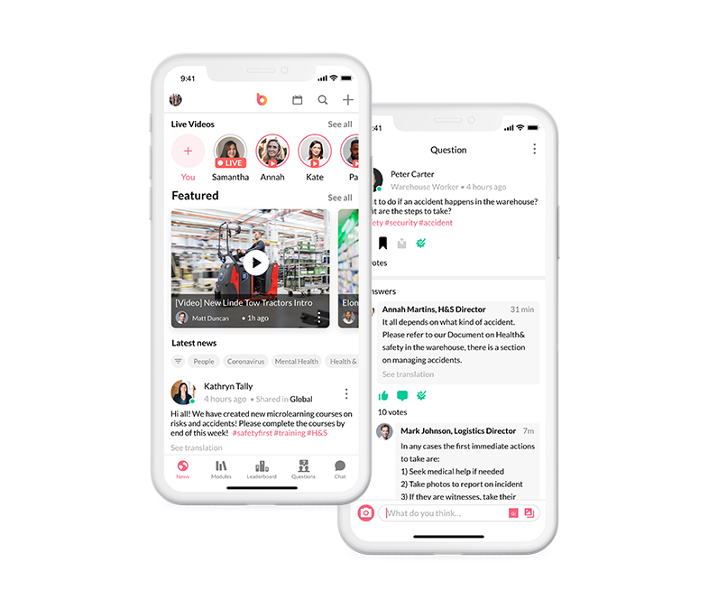 Share news and important updates through your own newsfeed, communicate in real-time through the chat and collect feedback through surveys and polls.