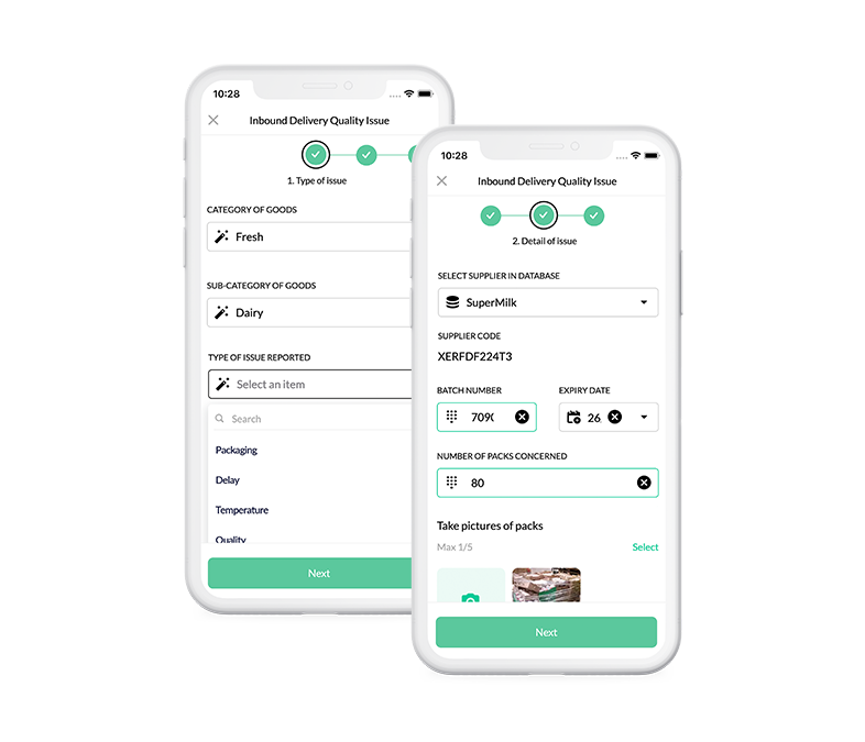 At warehouses, operatives can complete their inbound & outbound quality inspection checklist digitally in the YOOBIC app. When they detect an issue, they can easily and immediately report it by filling in a quick & intuitive form that can include rich fields such as photos, documents, barcodes and supplier codes. This is fully integrated with your WMS.