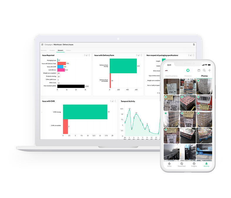 Once all the steps of the process have been completed, a report can automatically be sent to the supplier. At HQ, logistics and supply chain teams have clear visibility into all quality inspections completed and delivery issues raised. You can analyze them by type, supplier, location or operative in consolidated dashboards. If required, you can automatically calculate and trigger supplier penalties.